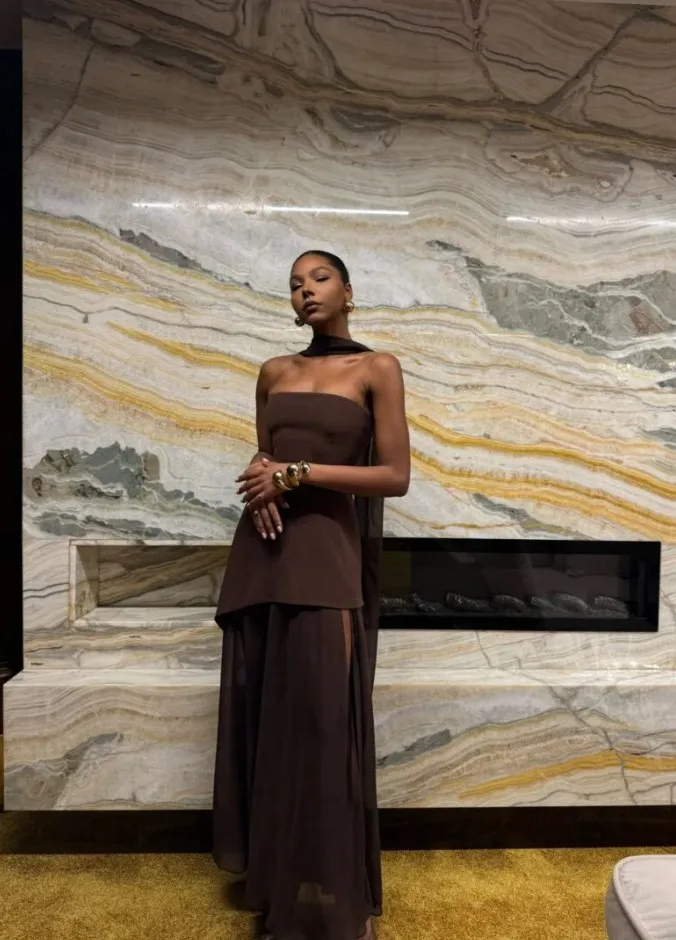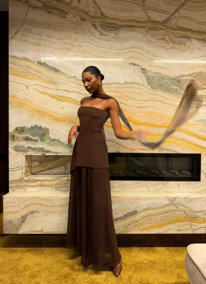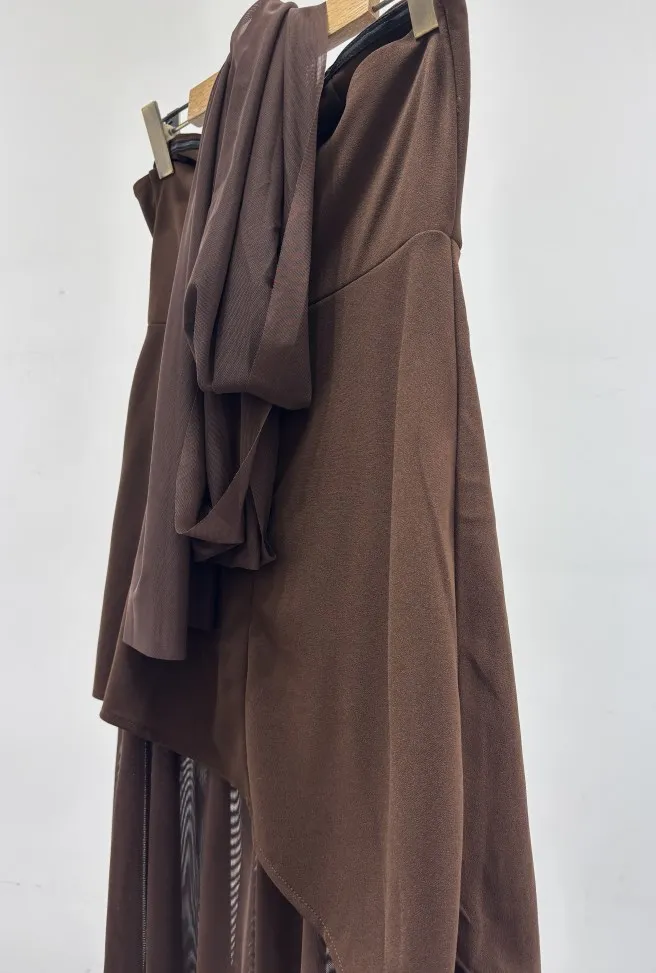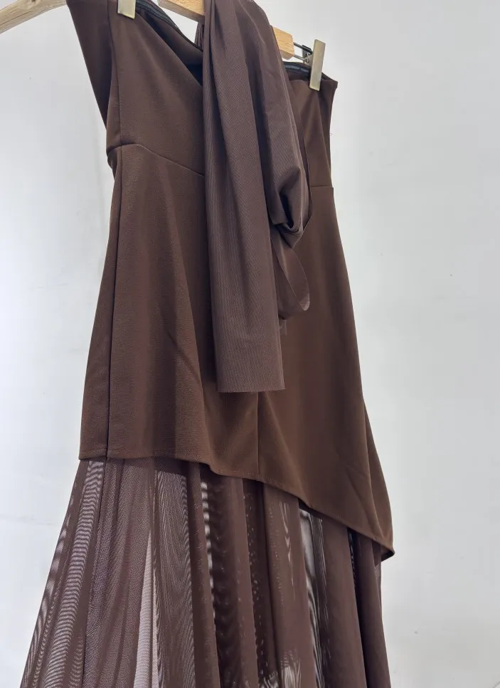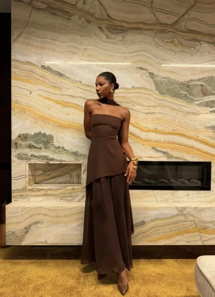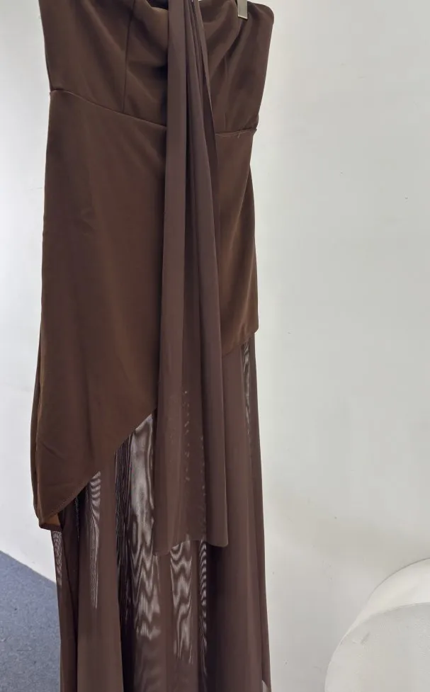 This elegant strapless dress in a rich chocolate brown hue features a structured, asymmetrical overlay bodice that flows effortlessly into a soft, floor-length skirt. Its minimalist silhouette is both timeless and refined, perfect for an evening event or sophisticated gathering. Styled here with gold accessories and pointed heels for a polished, modern finish.