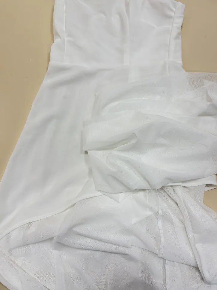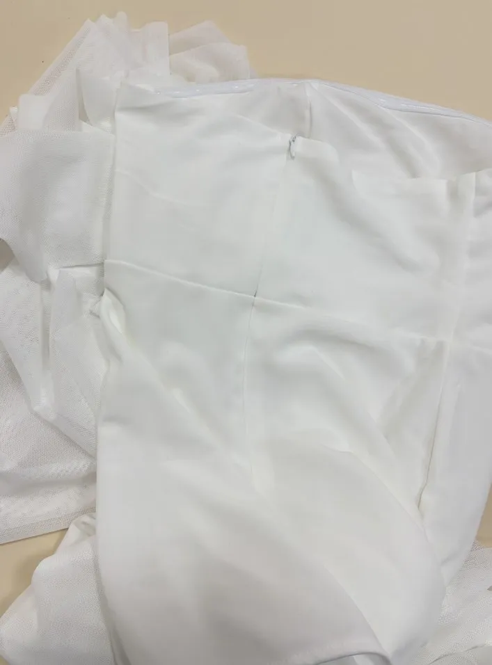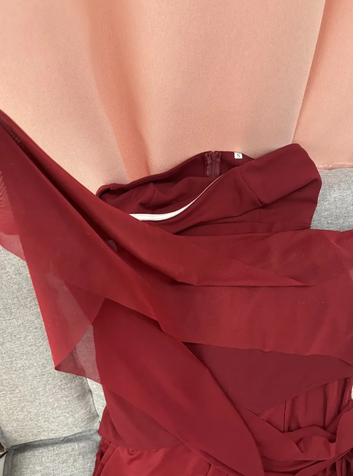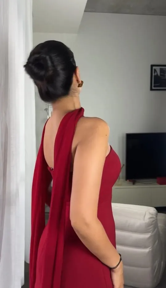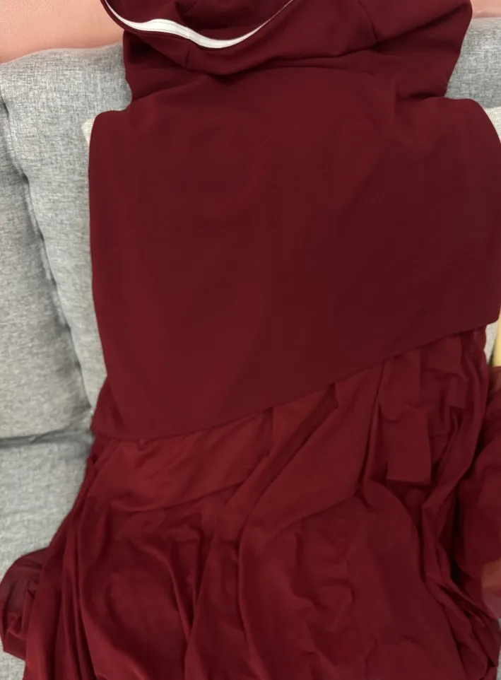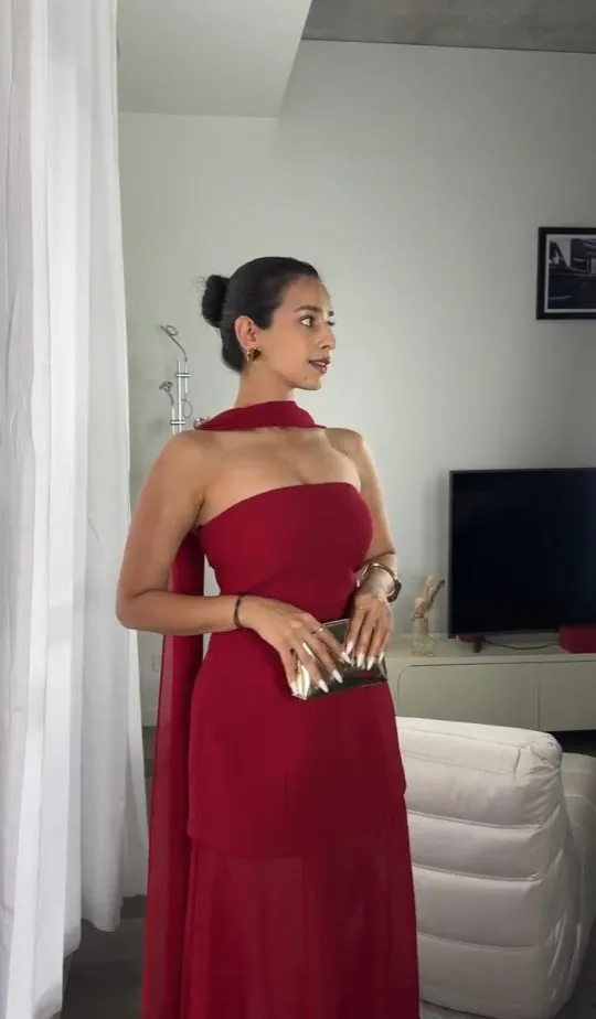 This elegant strapless dress in a rich chocolate brown hue features a structured, asymmetrical overlay bodice that flows effortlessly into a soft, floor-length skirt. Its minimalist silhouette is both timeless and refined, perfect for an evening event or sophisticated gathering. Styled here with gold accessories and pointed heels for a polished, modern finish.