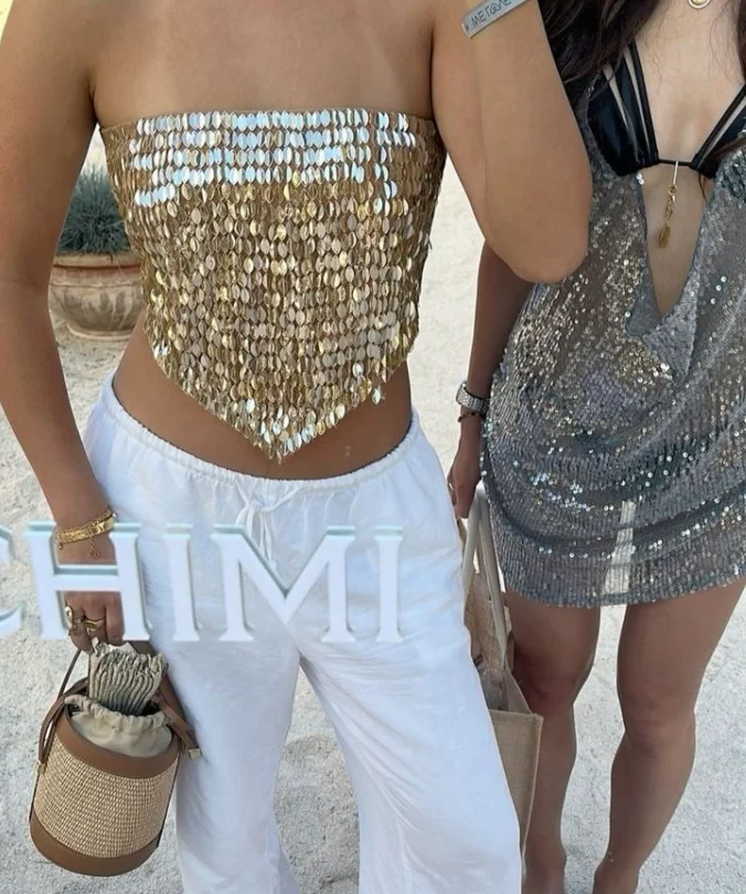 This glittering strapless top is made to shine — with hand-placed sequins, beaded embroidery, and a lace-up corset back that cinches your waist like magic.