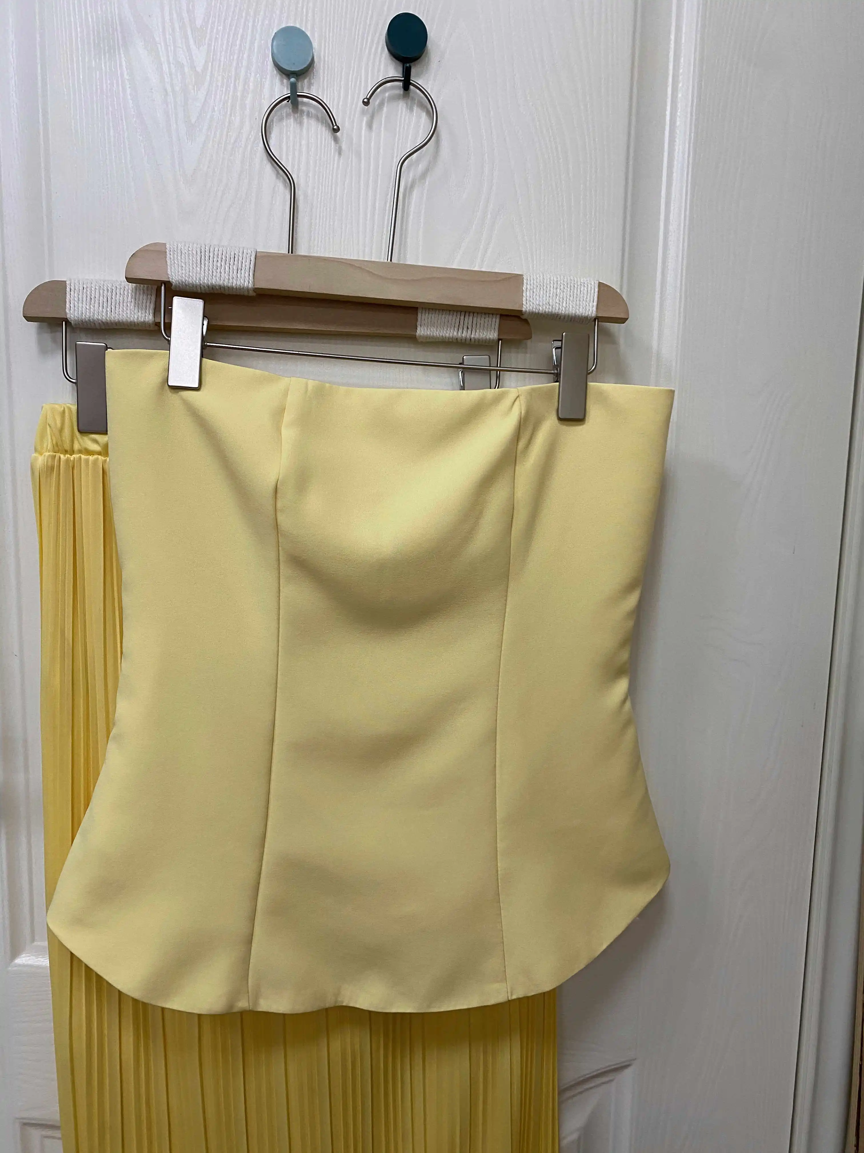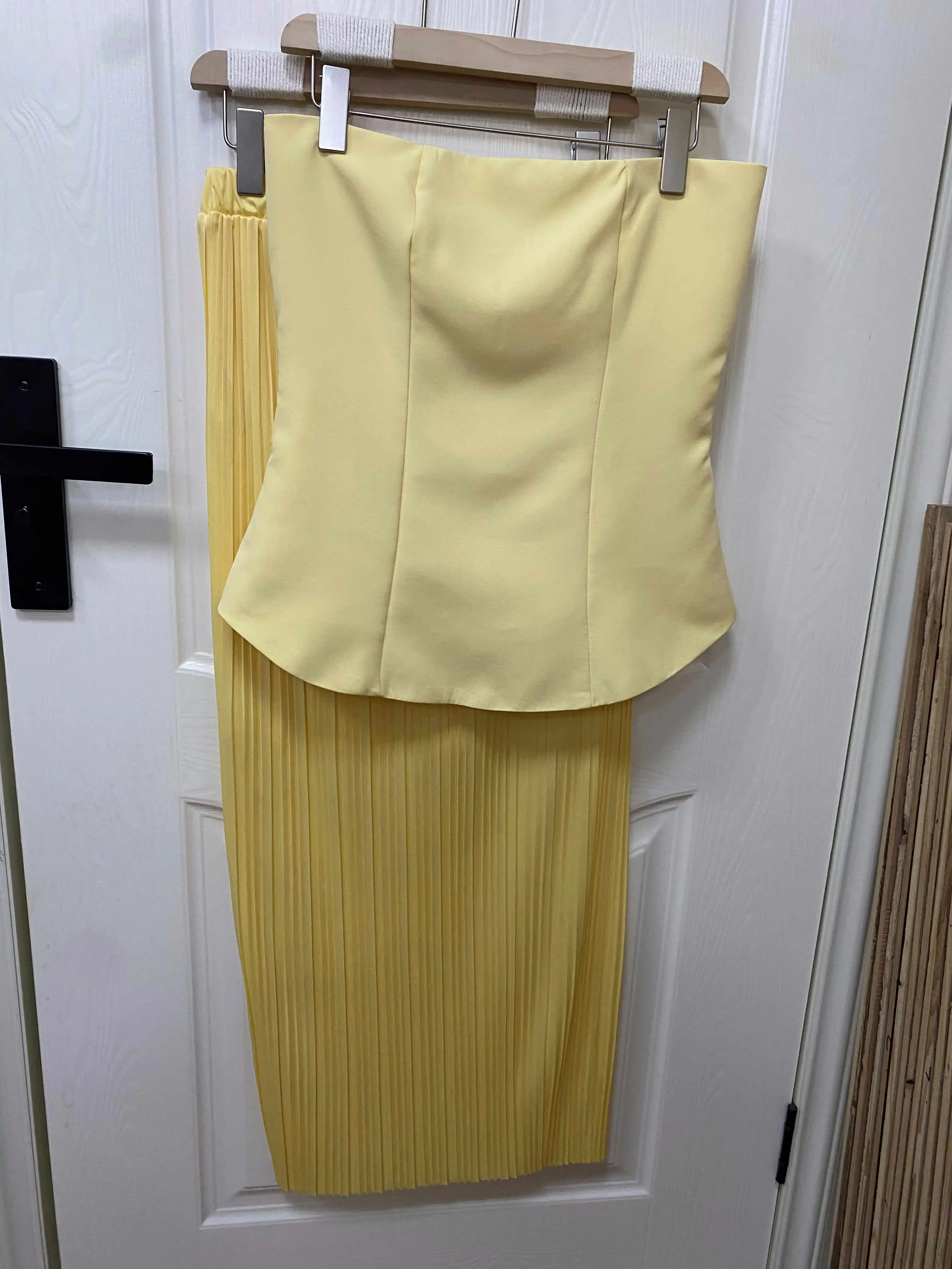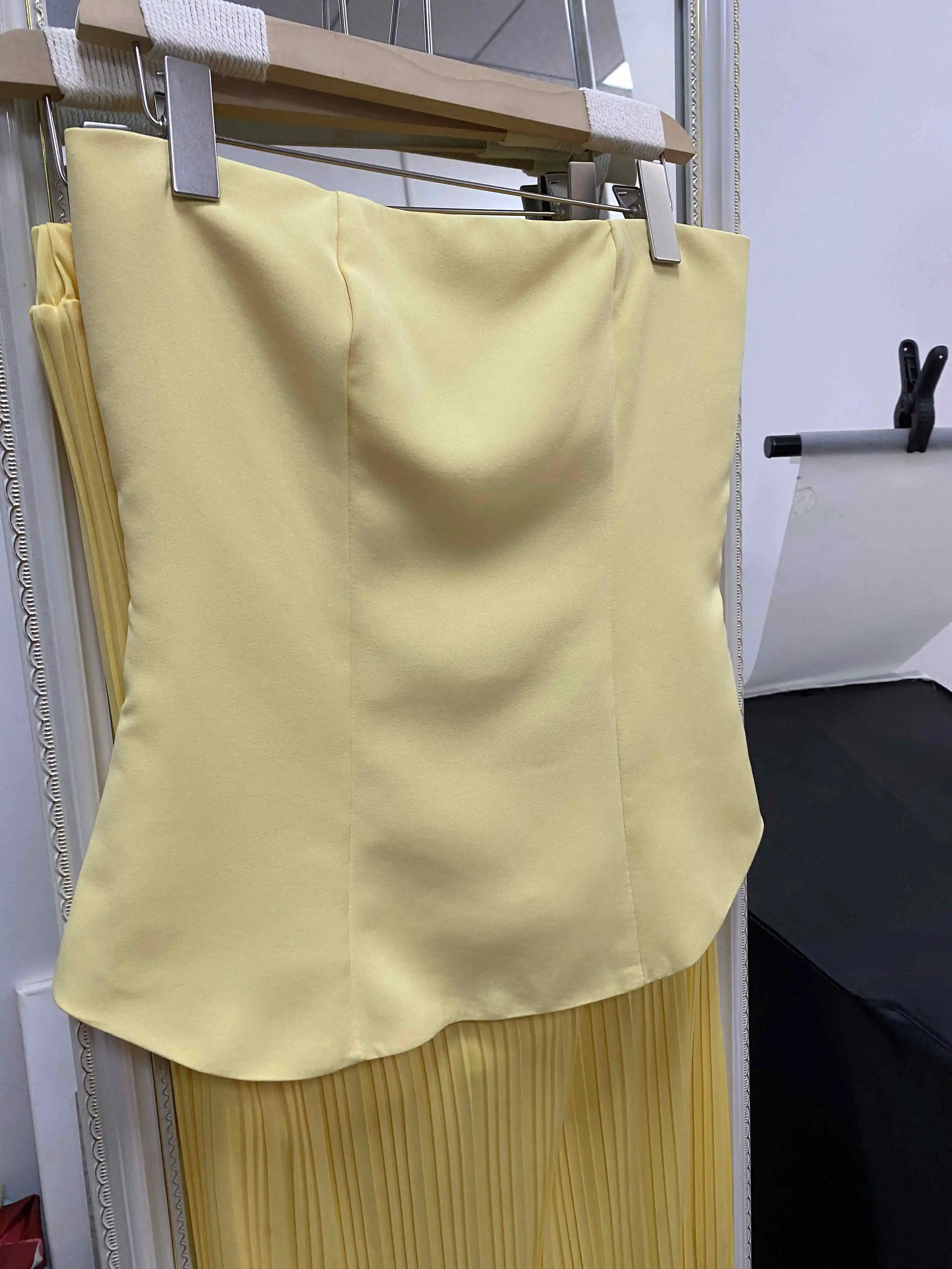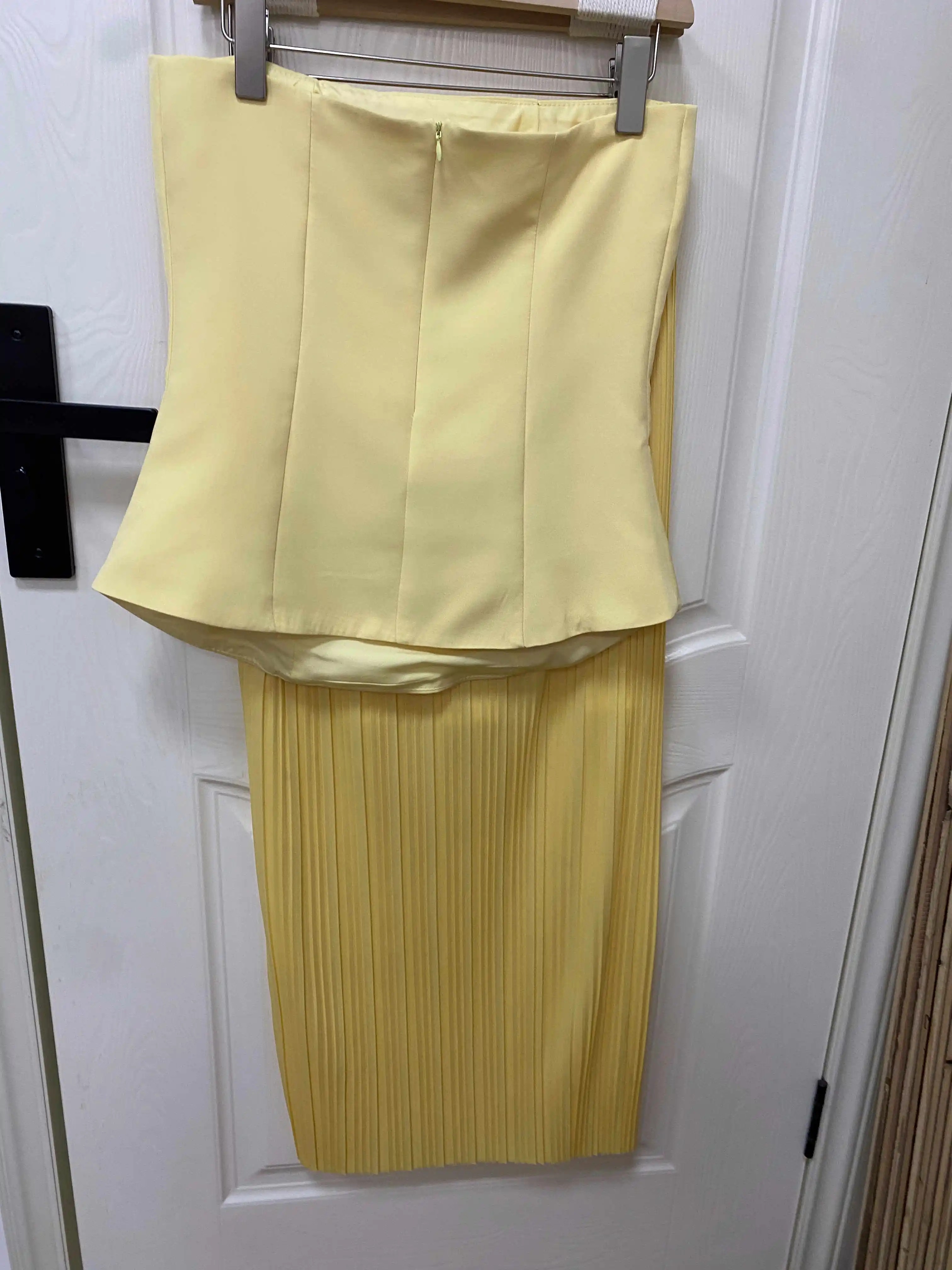 Radiate elegance in this stunning strapless gown, featuring a structured peplum bodice and a sleek, ribbed knit skirt that hugs your curves to perfection. The soft golden hue adds a luxurious touch—ideal for weddings, galas, or upscale evenings out.